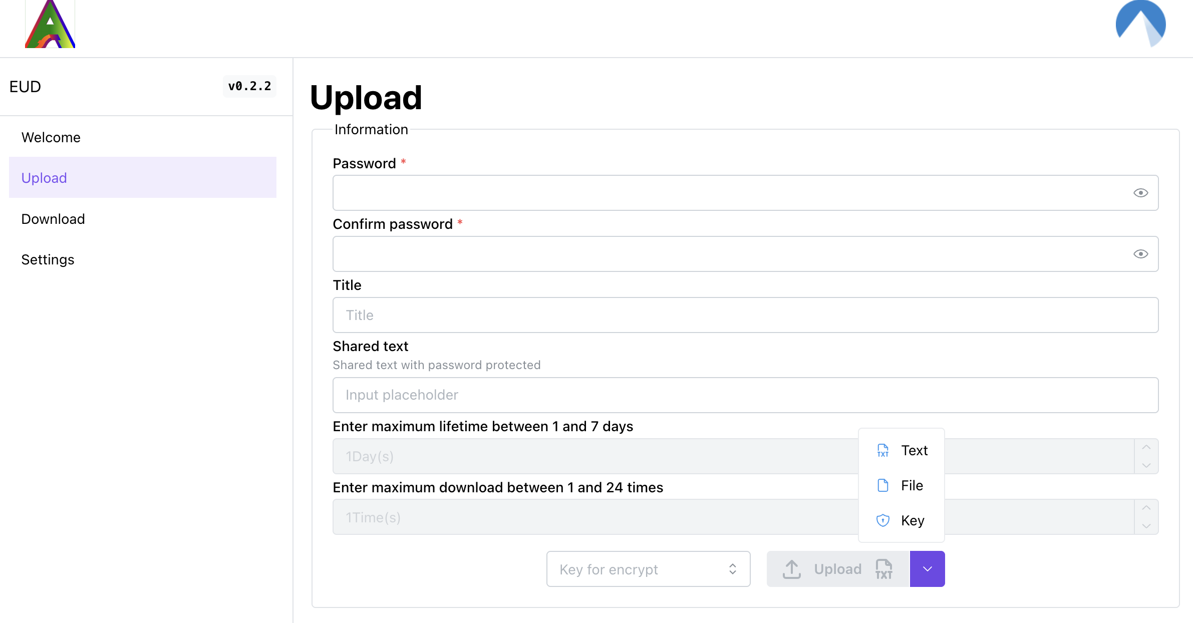 Upload the text or file with single password or stored key