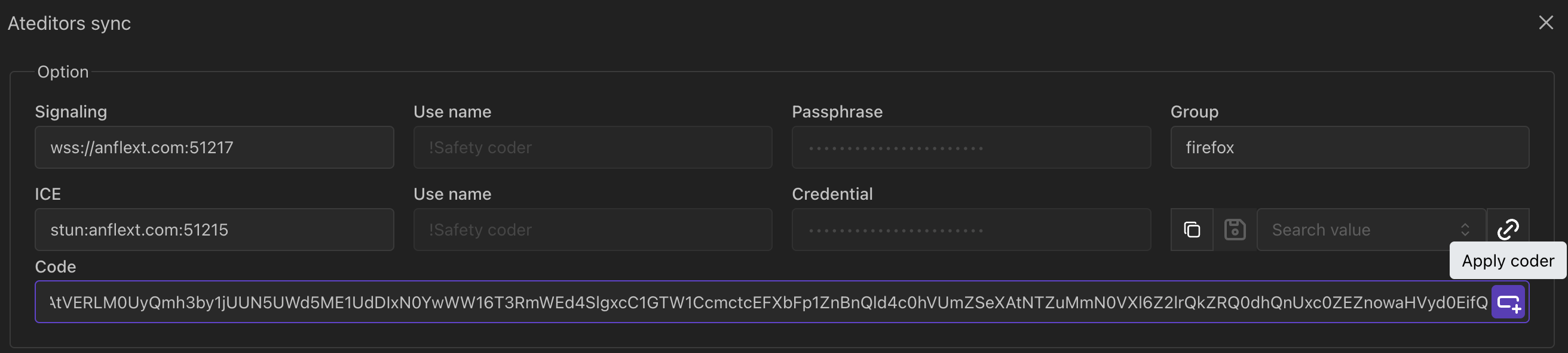 eyJpY2UiOnsidXJsIjoic3R1bjphbmZsZXh0LmNvbTo1MTIxNSJ9LCJsYWJlbCI6InRlc3QiLCJzaWduYWxpbmciOnsiZ3JvdXAiOiJmaXJlZm94IiwidXJsIjoid3NzOi8vYW5mbGV4dC5jb206NTEyMTcifSwic3NpciI6IjdCT09PWXNUN0VvTE4tY05VSUlZdTZUcFNOQ3ZWVFZtZ2dCSE5DeVY0Tjd6dE1VOXJ4TlJYeWl2LUJtZTlBMzg3WHljYUNSU1d0RWRKNXRBUlY3UFkxZkhEYlV3UW9sNVBLZXg0WHo0anZ4QnRxRGNmSlFDVEh2RnhDWmprdGc0bk9qWGhOdkxjN252cjIwdWtFeFBhWkFhVFhsYjFpVGlLV0RCekZZQzZJTXVHVTVQOXo0MVdaSF83SVZLRFZjWkJfalhDRjVzMmxIQnNDNEZRVUxLbjcyTDVGTmJjZlRGUmxhalFDc0o1eVBtM2pBSnVLTHAtVERLM0UyQmh3by1jUUN5UWd5ME1UdDIxN0YwWW16T3RmWEd4SlgxcC1GTW1CcmctcEFXbFp1ZnBnQld4c0hVUmZSeXAtNTZuMmN0VXl6Z2lrQkZRQ0dhQnUxc0ZEZnowaHVyd0EifQ粘贴以上 coder 到 ateditors 实时通信功能 option 的 code 字段,点击 Apply coder 按钮解码填充参数字段。